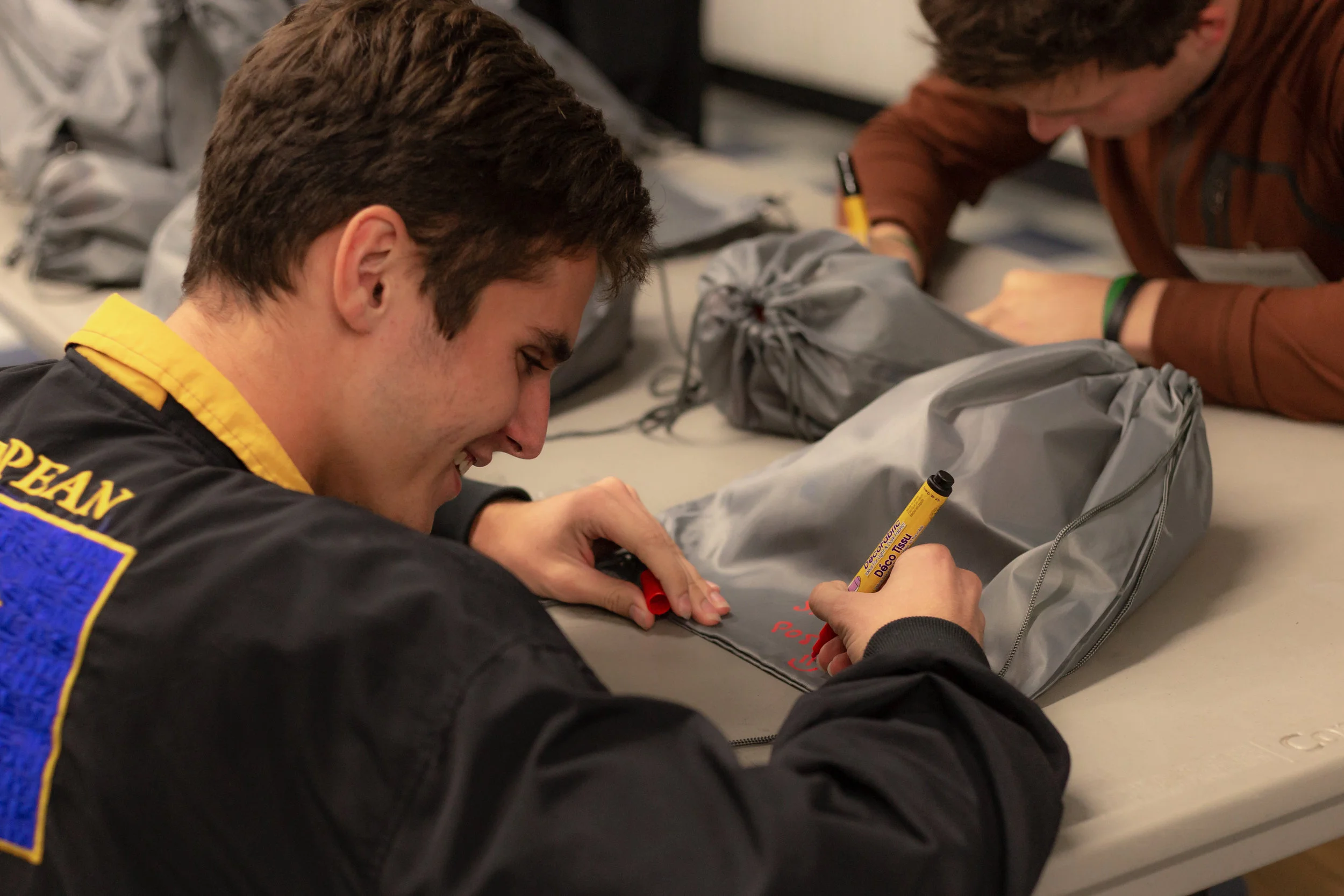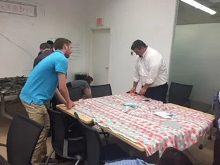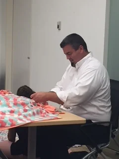 Teams #3 and #4 spent part of their evening at the Victoria’s Secret offices in Reynoldsburg creating blankets for the Ronald McDonald House at Nationwide Children’s Hospital, an event coordinated and hosted by Handshake Coach Mike Van Straten of L Brands. These blankets are part of a package given to the families of children who need a place to stay while their child is being treated at the hospital. A rough time is made a little less rough with these soft, comforting handmade gifts.