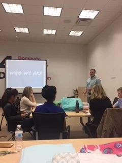 Facilitated by Adam Weingartner of Bluestone Wealth, teams #5 and #6 met at the mezzanine of the Ohio Health Chiller Ice Rink where they heard from Dave Caruso (http://www.carusohockey.com/), former Ohio State and professional hockey goalie, and Victoria Alesi, from the Huckleberry House. We’ll come back to Dave in a moment so that we can address the giveback portion of the evening. Victoria opened our eyes to the reality of homelessness among teenagers in Columbus. Huckleberry House is a shelter for teens in need and who are willing to accept help. The program is comprehensive in that it gives them real hope and real help during this already difficult time of life. The coaches and students filled backpacks with necessities and snacks and then added a touch of Positivity by putting encouraging messages right on the bags.
